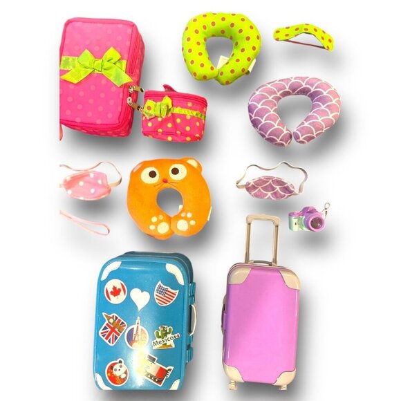 Doll Travel Set, 4 Suitcases, 4 Neck Pillows, 4 Cameras, 3 Eye Covers and More