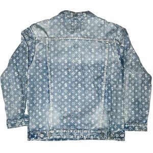Sold on Depop | Large denim jacket by Victorious Denim with dollar-sign monogram print, side and chest pockets. Washed texture with some additional wear under one arm. Gently used.