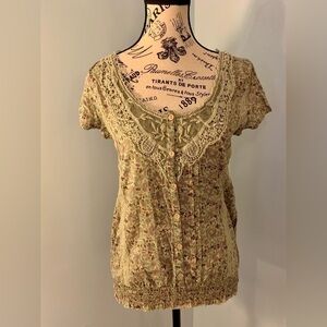 Dolled Up by Fang-Cottage-core style lace and button floral print in olive greens, pinks, and turquoise. Excellent condition.