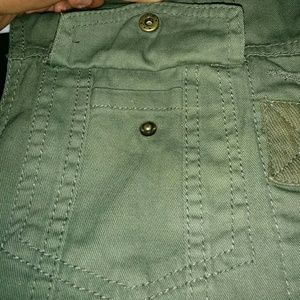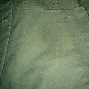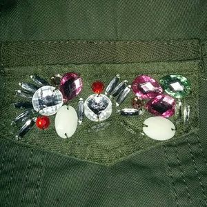 Army green colored vest. Listed as Medium but fits more like a Large - X Large. Cute jewels on left breast. Has four (4) pockets on front and two (2) inside makeshift pockets. This vest is the perfect piece to tie any outfit together but is unfortunately too big for me.