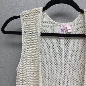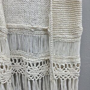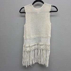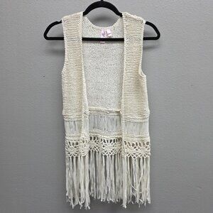 Dolled Up Vest Womens Medium Oatmeal Knit Open Front Fringe Tassel Crochet Boho