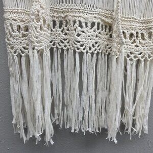 Design: Textured knit body with crochet/macramé paneling and long tassel fringe at hem