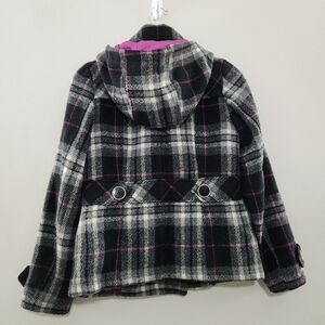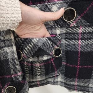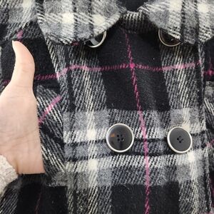 Chic plaid pea coat with bold pink accents. Double-breasted design with stylish buttons. This is a wool material and very thick. such a cute jacket. Ideal for a fashionable look.