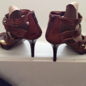 Dollhouse Brown Faux Leather Strappy Gladiator Heels Sz 8 are stacked with beautiful features! Faux brown leather straps in 5 tiers from the open toes to the ankle cuffs. Zips up at back of ankle. 5" stiletto heel with ceramic like platform front soles. Goes Really nice with the features halter top! Top sold separate! Previously loved shoes, has a water spot on both toes See pic) but will not be noticable when wearing. In great condition.