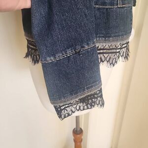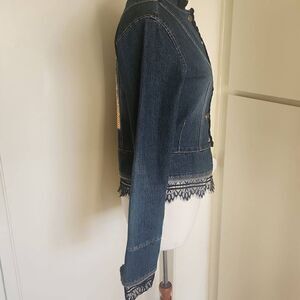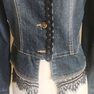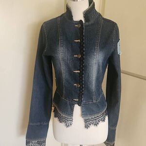 Dollhouse Denim Upcycled Custom Jacket, Military Style, Lace, Sequin Patch, M