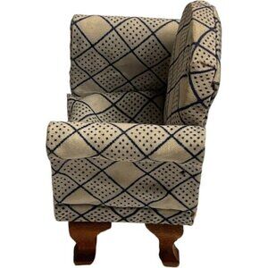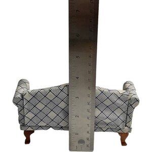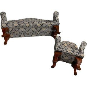Dollhouse Furniture Sofa and Arm Chair Wooden Legs Blue White Checkered Vintage