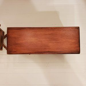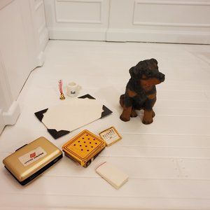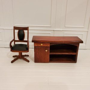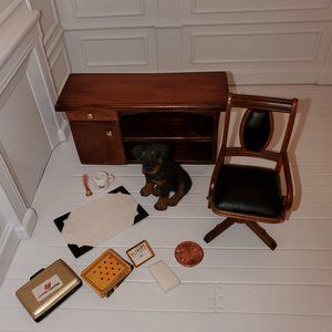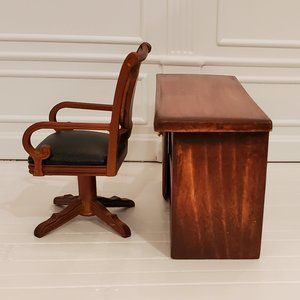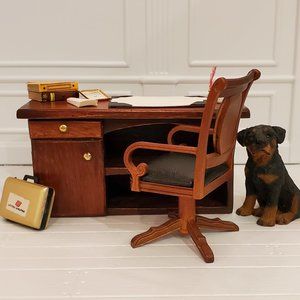 Handmade OOAK Desk from oak wood. Everything is 1:12 scale. Mahogany chair with soft, supple leather. Accessories included. Signed by artist, BDW 2021 1/1. He just finished it. Photos taken in a dollhouse room box. Desk was not made from a kit, master carpenter created. Chair is vintage as are the other accessories. Chrysnbon desk pad and ink well, ceramic Dad mug, United Airlines briefcase, 2 books, desk calendar, note pad, and good boi pupper included. All in wonderful condition.