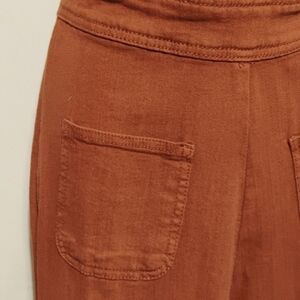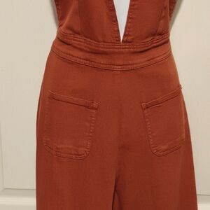 Rust/ copper colored jump suit by Dollhouse. Wide leg, 2 visible front pockets. Thick straps that criss cross, open back silhouette- straps are adjustable. Back zipper & button closure. Material is a very stretchy 2 way stretch = really hugs your curves like a lightweight jean material. excellent condition Love Dollhouse ❤️