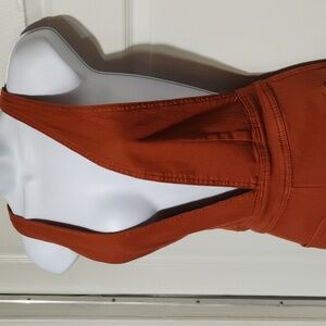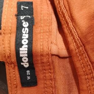 Rust/ copper colored jump suit by Dollhouse. Wide leg, 2 visible front pockets. Thick straps that criss cross, open back silhouette- straps are adjustable. Back zipper & button closure. Material is a very stretchy 2 way stretch = really hugs your curves like a lightweight jean material. excellent condition Love Dollhouse ❤️