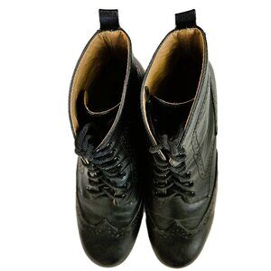 These Women Dollhouse Combat style, Gothic, Grunge Ankle Boots feature Lace-up front closure making them a staple in one's winter shoe wardrobe, 1.5" Block heel, Round perforated wing-tip toe for added style. Made of man made material. Preowned. No flaws. Very Good Condition.