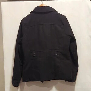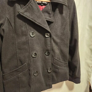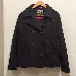 Women's size L, Dollhouse, black peacoat. Double breasted, red lining and two front pockets. Polyester and wool, made in China, machine washable.
