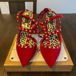 New without box red Dollhouse Gravity studded heels. Size 7.5 with a 4.5 inch heel and adjustable ankle strap. Non skid rubber sole. Vegan nubuck suede in a beautiful shade of red.