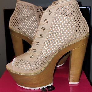 Take your style to new heights with this bold bootie's towering platform heel and geometric cutouts. Adjustable laces ensure a comfortable fit.