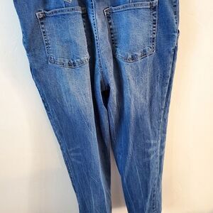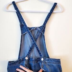 Square neckline; button closures at sides and at front bib; adjustable straps