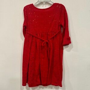 For sale is a Dollie and Me Sweater Dress. This is in good used condition. It is size 5. The sweater dress is long sleeve, solid red with red sparkles decorating it throughout. There is a red satin belt and bow on the front, the belt is similar to an empire waisted dress. Has a tie back belt on the back. Slip over the head and has ruffled wrists. Gently used condition. Inner tag is in great condition. It is knee length. Perfect for the holidays. Comes from a smoke free home.