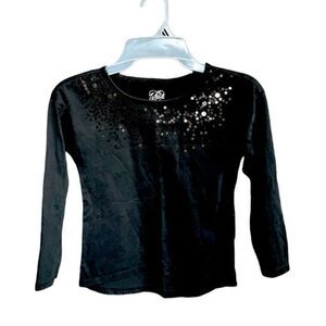 Charming Dollie & Me dress. The top portion of the dress is designed with a long sleeve multicolor knit sweater that is lined underneath in white. While the bottom part is a fuchsia, pink tulle skirt with a pink lining. In a size 5, this dress is fashioned with a keyhole, neck in back with a button closure and a beautiful flower accent in front. Perfect for formal occasions.