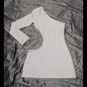 Asymmetrical design with one long sleeve and one cold shoulder, a circle cutout at the side, and a bodycon fit. Polyester Blend