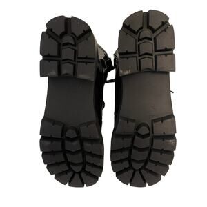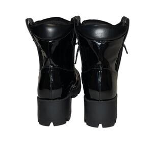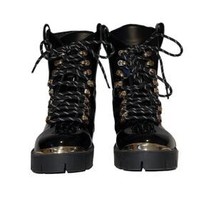 Challenge me lace-up boots cause you never back down. Your up for it in these silk vegan leather boots that have a black glossy patent shine, chunky treaded rubber soles, gold hardware steel toes and adjustable hiker laces to tie up the front. Man made materials, 2 inch chunky heel. These boots are brand new without the tags or box. Excellent condition.