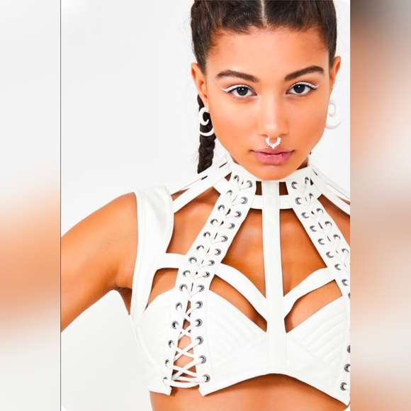 NWOT Lace-up high quality euphoric vegan leather in cream/white top 'Rude Awakening' by Club Exx. With cut-out detailing, paneling, and a structured boning bodice, this top features a high neckline and lace-up design. The cropped fit and back zipper closure ensures you stay comfortable while turning heads