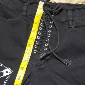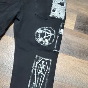 Stylish black jeans with striking graphic patches. Features lace-up front and unique designs.distressed cuffs and waist