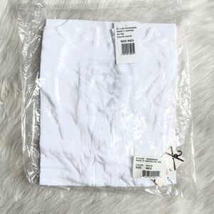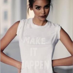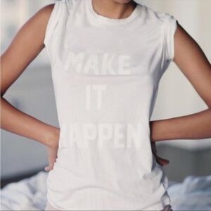 This comfy white tee features short sleeves and white "Make It Happen" text across the front.