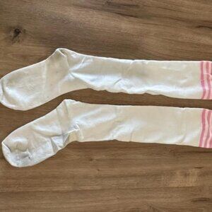 Keep your spirits high in this cheerleader costume that comes with a halter top and matching pleated skirt with graphics on the front, matching panties that say 'spank me', pom poms, and thigh high socks. Costume worn once for two hours. In good condiiton. Wear noted on socks. Underwear unused/unworn. Size XXL.
