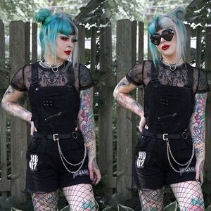 Dolls Kill Killstar Cassidy Overall Denim Shorts w/ Patches H8 U2 Distressed
