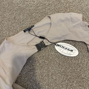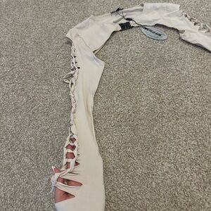 Stylish beige long sleeve shrug featuring lace-up detail on the sleeves. Perfect for layering.