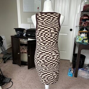 Dolls Kill dress, Pretty Garbage mini dress, checkered bodycon dress, sleeveless sweater dress, brown and tan mini, Y2K aesthetic outfit, retro swirl print dress, soft knit dress, cozy fitted dress, statement mini dress, edgy party outfit, going out dress, fall fashion mini, Gen Z fashion, Instagram-worthy dress, brunch outfit inspo, coffee date style, grunge cute fashion, aesthetic streetwear dress, trendy knitwear, 2000s style, sleeveless fall dress