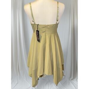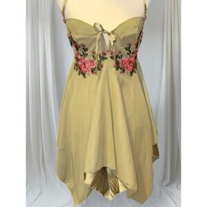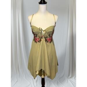 Fairycore perfection! Completely sold out online! This is the Sweet Sway Mini Dress from Dolls Kill’s Current Mood line, new with tags. Features a soft olive green fabric with gorgeous pink floral embroidery, a tie-front bust, adjustable straps, and a floaty handkerchief hem. Romantic and whimsical with the perfect fairycore-meets-Y2K vibe.