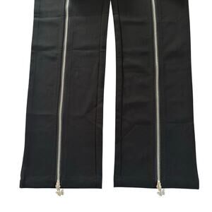 Features: Dolls Kill The Kript Black Butterfly Zipper Pull On Y2K Pants; front full length zippers on both legs, top zippers can be pulled down, silver butterfly zipper details, pockets on sides.