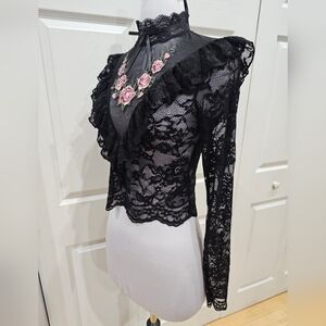 cuz your romance is the best. This top has a sheer floral lace construction, ruffled lace detailing, long sleeves, a sheer mesh neckline with ribbon ties, an embroidered rose design on the front,double button closure on the back, and a scallop hem.