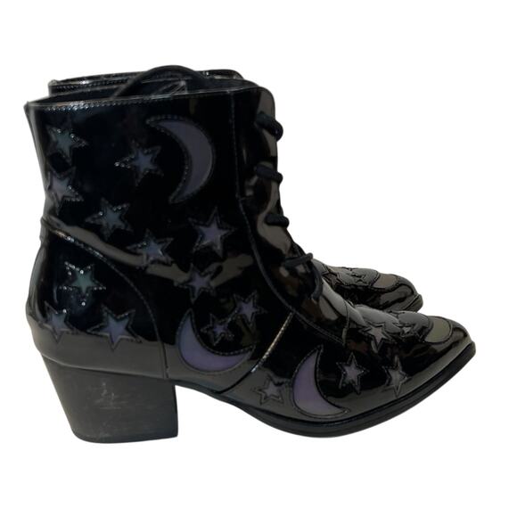 Dolls Kill yru patent black aura moon & stars holo reflective pointed boots Sz 7