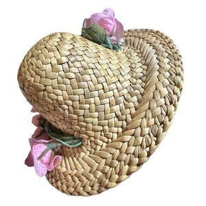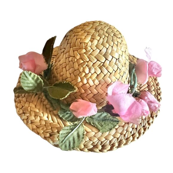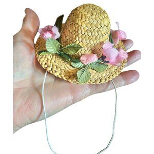 Doll’s Straw Hat with Pink Silk Flowers Rosebuds 4" diameter, 2" head diameter