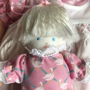 material: vinyl hands, feet and head with soft body and fabric (clothing), with a mini Pauline rag doll of her own