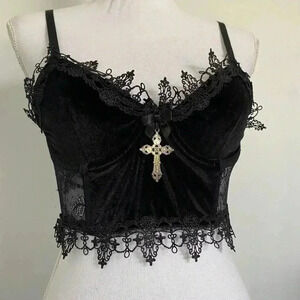 Dolls kill dark morphine eyes velvet bra. Black velvet material with lace detailing. Cross pendent. Adjustable back. Retail is $38