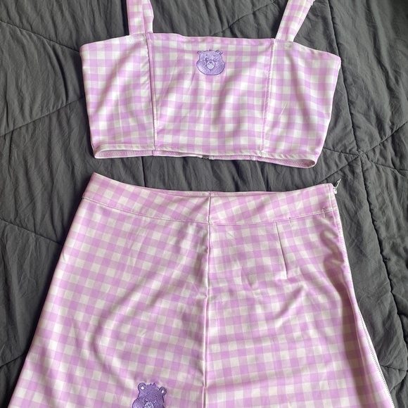 Zip up crop top and mini skirt each in size large and in a pink gingham pattern with care bear face on top and an emblem on skirt