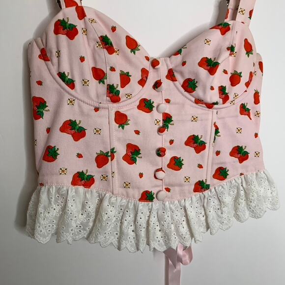 cuz hello wanna collect strawberries - This top has an all over strawberry pattern, a fabric lace eyelet hem, adjustable shoulder straps, an underwire bust, structured boning, a sweetheart neckline, decorative buttons, and a back lace up closure.