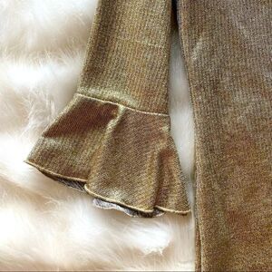 Gold shimmery color, interior back underneath lining that falls a little lower than dress for a layered look, ruffled bell sleeves, round neck