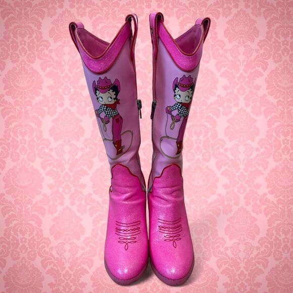ICONIC Betty Boop cowgirl boots from Dolls Kill! Bubblegum pink with sparkly glitter accents and the most detailed Betty Boop cowgirl design. She’s wearing her full western outfit with checkered shirt, pink hat, and golden lasso!