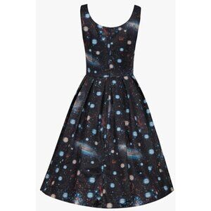 This retro frock from Dolly & Dotty features a flattering fitted bodice, a scoop neckline, and a 50's swinging skirt with box pleats. The gorgeous print is of planets on a deep space background and the fabric is made from super soft-touch polyester with nice stretch. The sleeveless dress has side seam pockets and a hidden back zip.