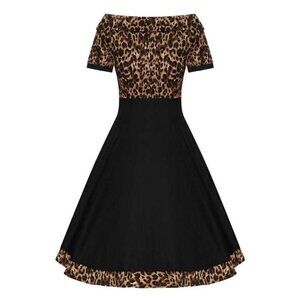 The Darlene dress from Dolly & Dotty is a wonderfully versatile 50's style swing dress, perfect for any occasion! It features flattering short sleeves, a wide-fitted waistband, a vintage full circle skirt, and a slightly off-the-shoulder neckline. This rockabilly frock is made in a beautiful leopard print on top and at the hem, with a solid black skirt, waistband, and sleeve cuffs. It fastens with a concealed side zipper.