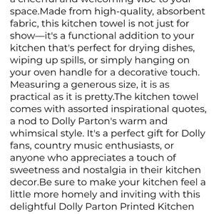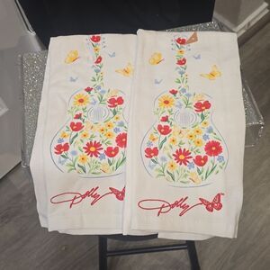 White kitchen towel featuring a floral guitar design with red, yellow, and blue accents. Signature Dolly Parton style.