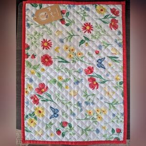 Beautiful floral quilted placemat with vibrant red trim. Features colorful flowers and butterflies.