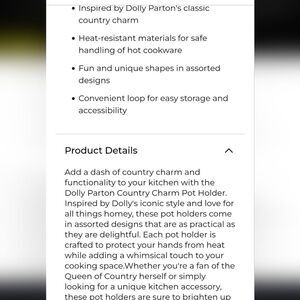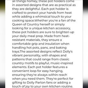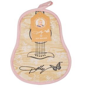 Charming pot holder with a guitar design. Features Dolly Parton's signature. Perfect for music lovers.