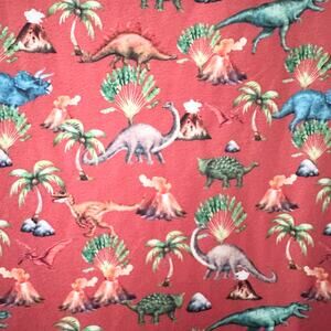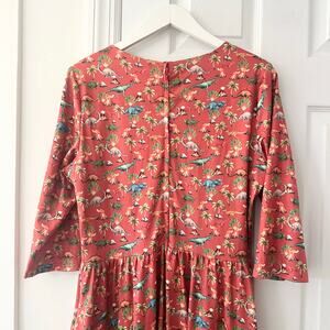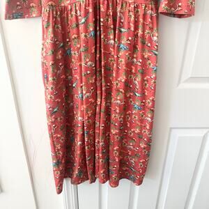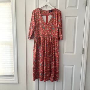 Size 10 from Dolly and Dotty. Style name Billie. Red (light burnt orange red colorway) dinosaur and volcano printed flared midi dress with v neckline. Back zip closure. Full pleated skirt. Stretch jersey material. Preowned in good condition with no stains or tears.