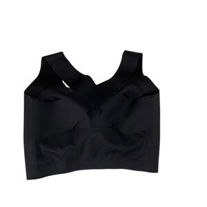 This stylish black bra features a sleek, seamless design with wide elastic shoulder straps that offer added support without digging in. The molded full-coverage cups provide a natural lift and shaping effect, while the crisscross elastic detail at the neckline adds both support and style.