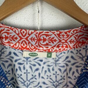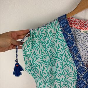 Colorfule print, 100% cotton, pullover styling, short dolman sleeves with tassel ties, v-neck, pockets, size medium.