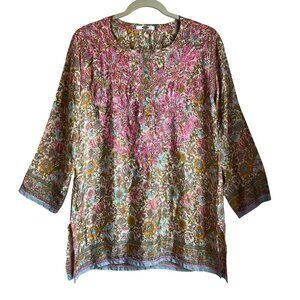 Dolma Medium Floral Pink Hand-Embroidered Tunic Top Lightweight Silk Bl Boho