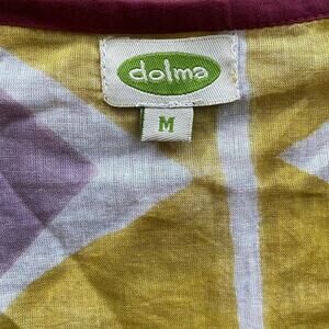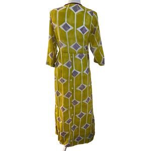 Beautiful condition Dolma Iris Long Wrap Dress. Chartreuse, purple and white geometric print. Very lightweight semi sheer cotton fabric. You would need to wear a slip under it. Would make a great swim coverup. Size Medium.